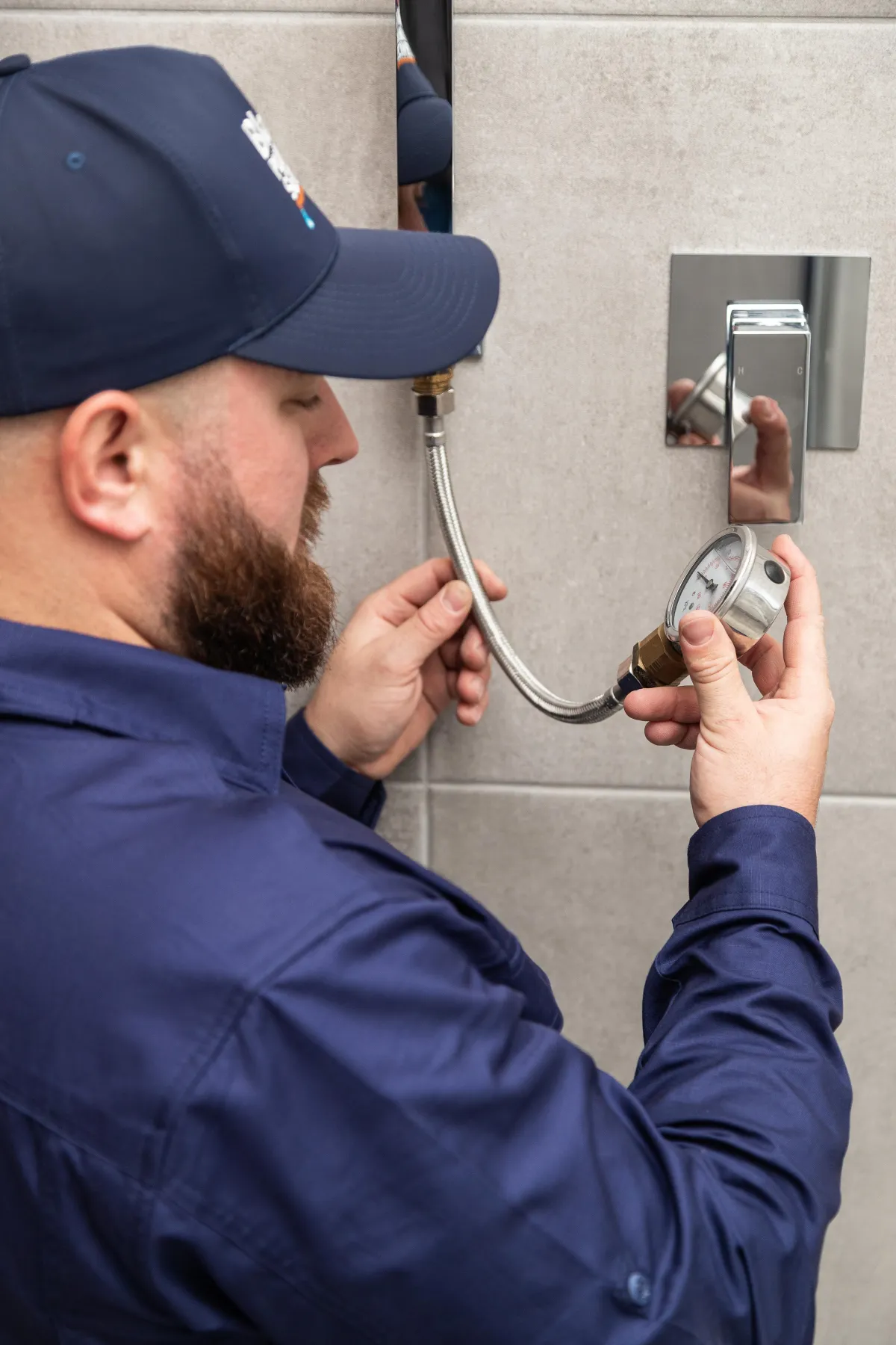 We check the water meter installation and measure both the inlet pressure and the outlet pressure at the meter. This shows whether the issue begins at the street supply or further inside your system.